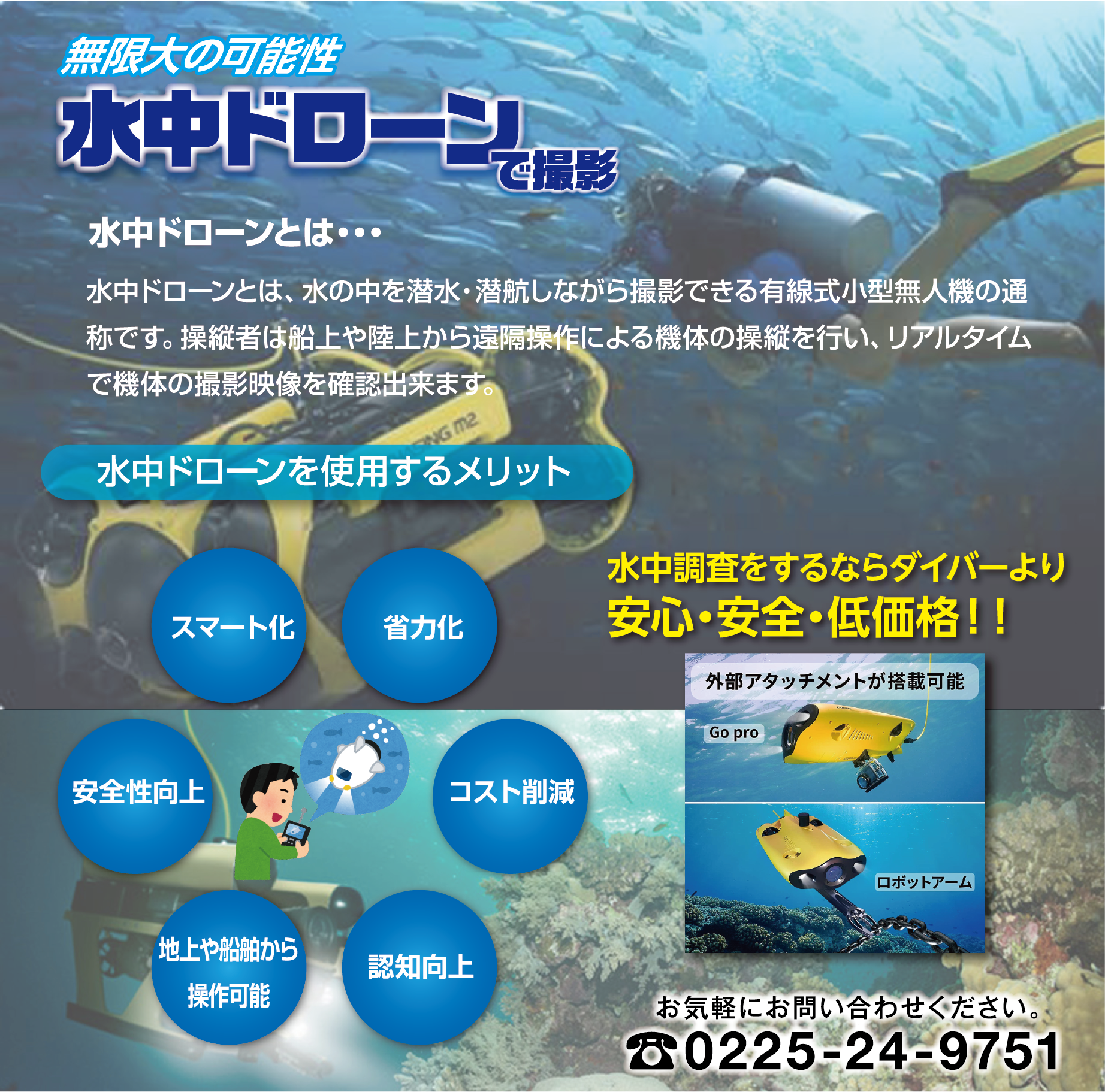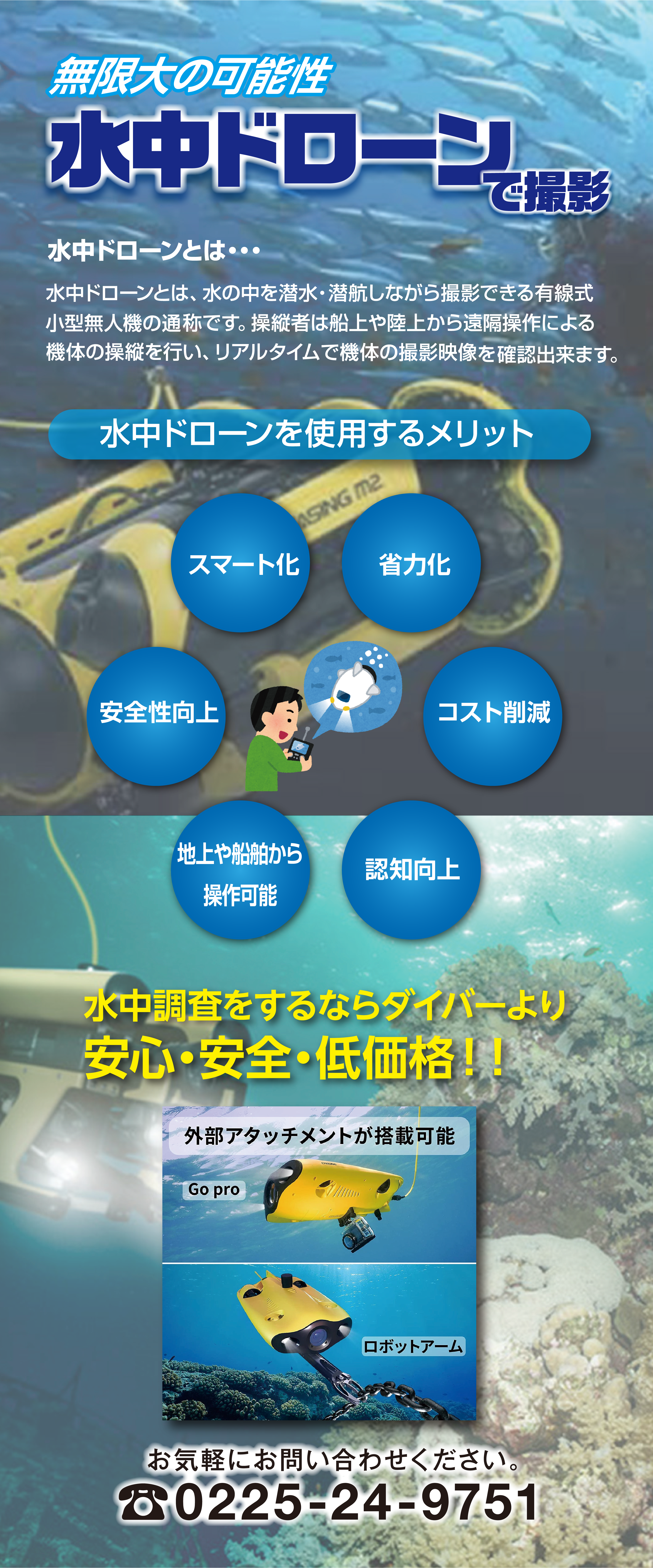 複数のスラスターから自由に潜水・潜航可能な機体や高画質・高精細カメラを搭載した機体、 潜水可能深度が100mに達する機体など、日々進化する水中ドローンの性能は、個人で楽しむ趣味の領域を超え、 新たな水中ビジネスを生み出す可能性を持っています。